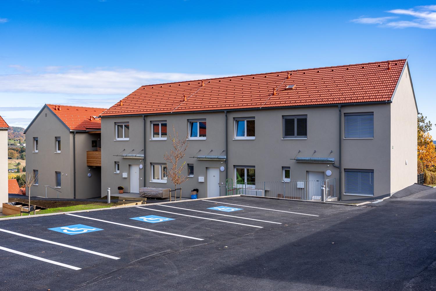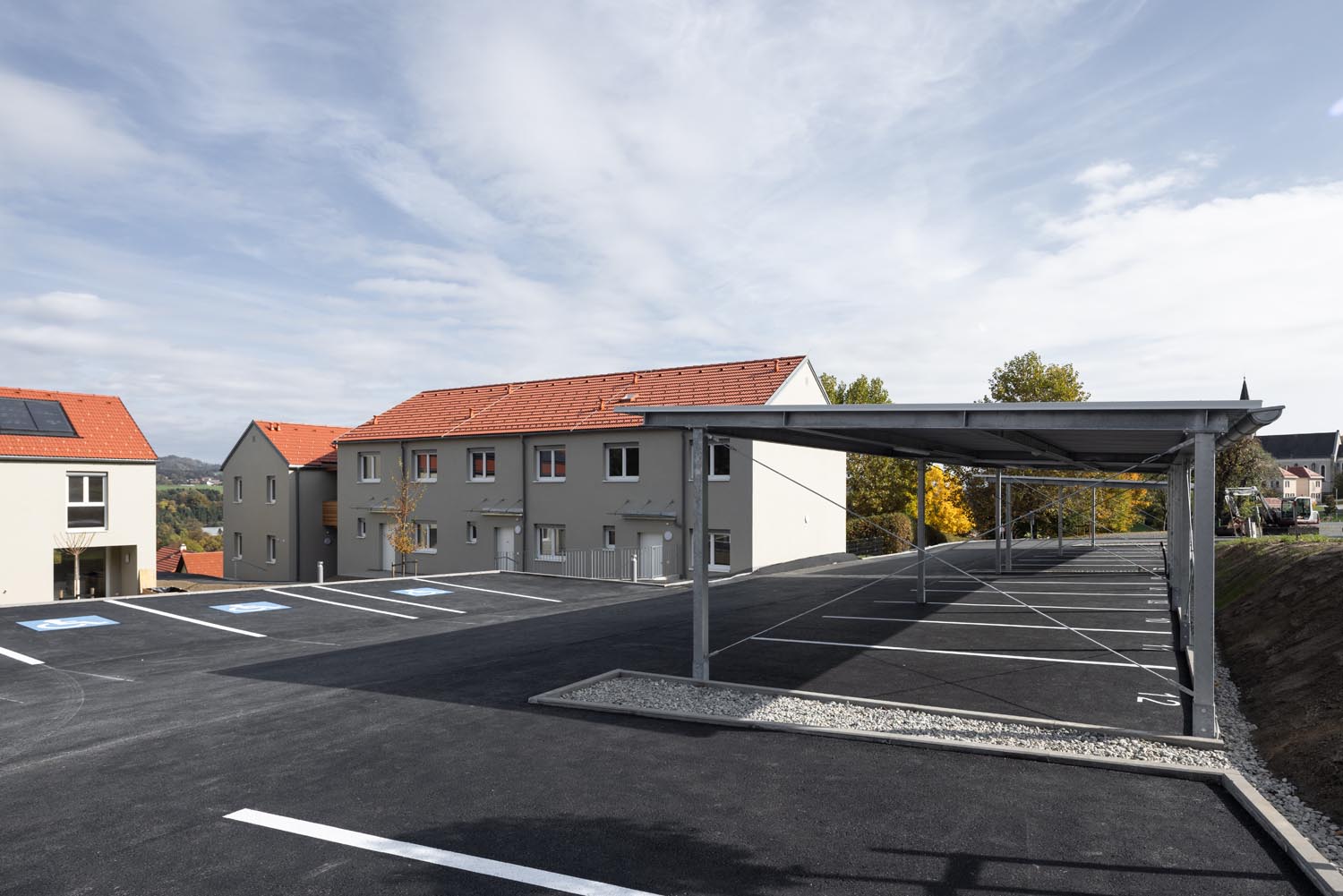 Neubauwohnungen mit roten Dächern und Carports in der Siedlung Bartholomä